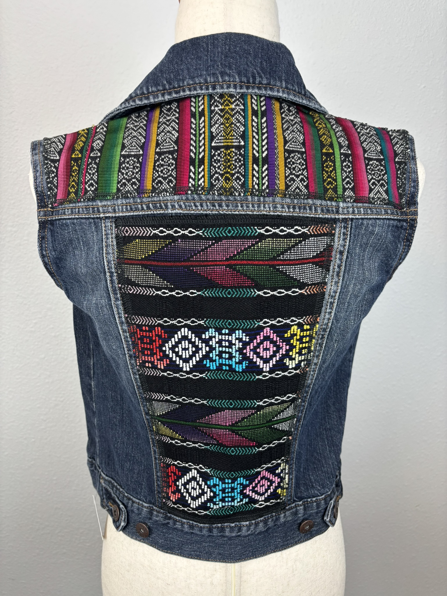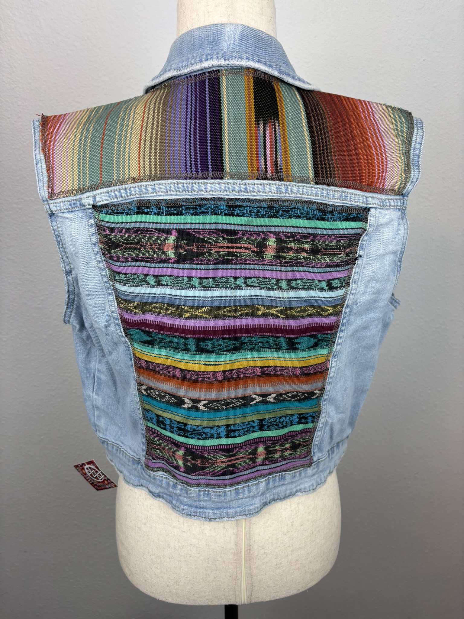 These upcycled denim vests are the perfect piece for layering and always guarantee a cool look. The fabric accents are scraps of handwoven Mayan textiles, Pendleton® wool, and other ethnic textiles. Each piece is one-of-a-kind.